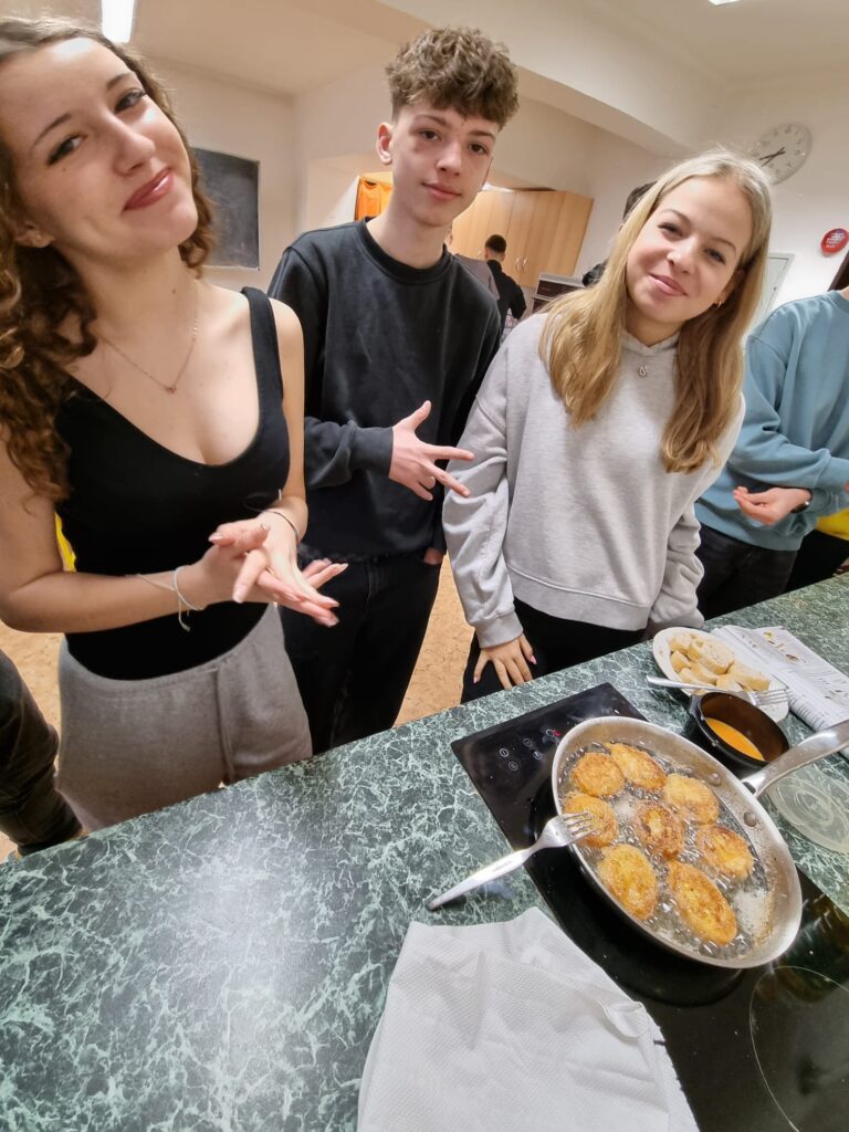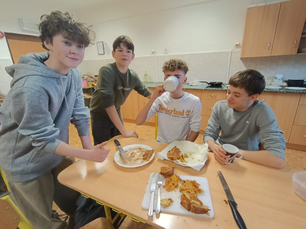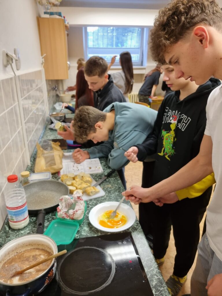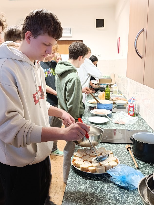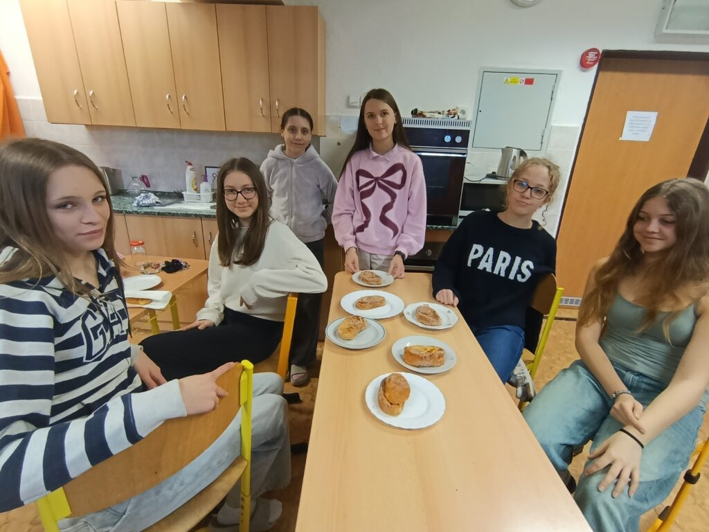 Studenti španělštiny 8. a 9. tříd se pustili do přípravy sladkých torrijas, které patří mezi oblíbené sladké pokrmy ve Španělsku během velikonočního týdne – Semana Santa. V jedné hodině se nejprve seznámili se slovní zásobou a postupem, aby se v té nasledující vrhli do pečení.
