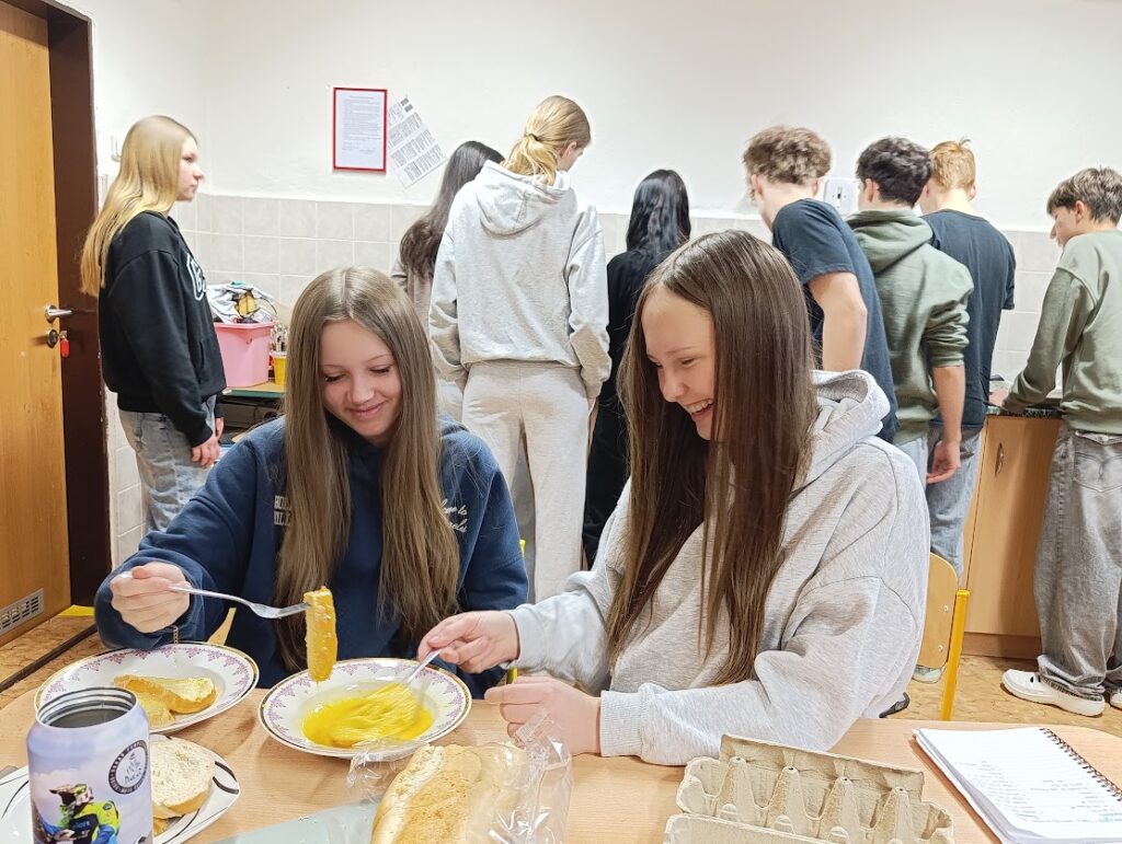 Podle jednoduchého receptu studenti namáčeli plátky pečiva do mléka ochuceného skořicí, citrónovou kůrou a cukrem, poté je obalili ve vajíčku a osmažili dozlatova.