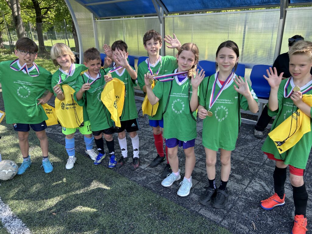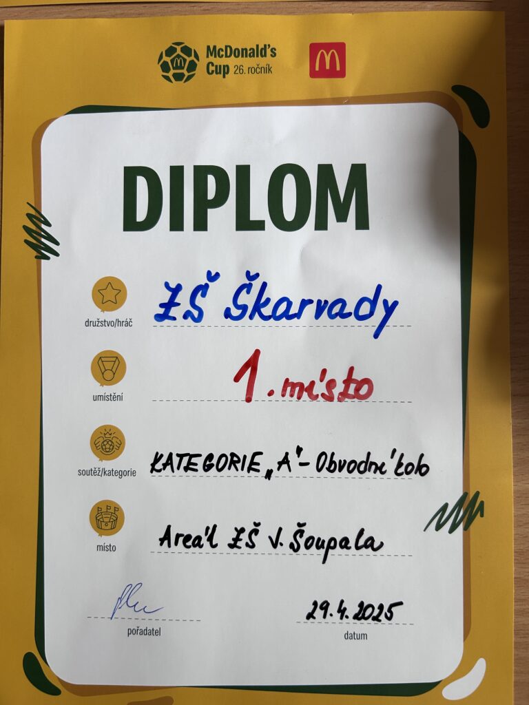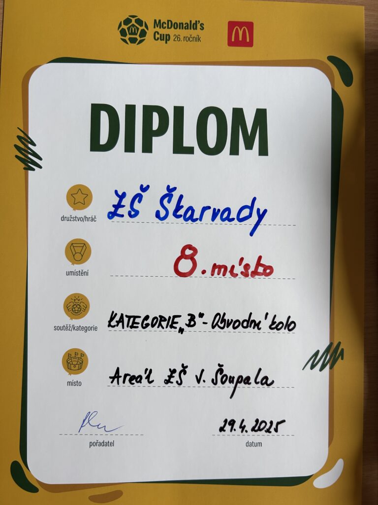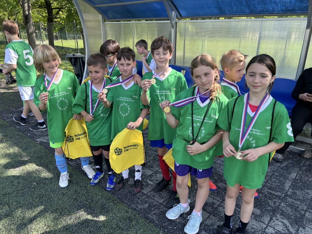 Dne 29.4. 2025 se 2 družstva naší školy účastnila obvodního kola MC Donalds Cupu. Turnaj se konal na ZŠ Šoupala, kde ve velké konkurenci družstvo A (1. – 3. třída) obsadilo 1. místo a odneslo si zlaté medaile. Zajímavosti tohoto ročníku je, že v družstvu musela během hry hrát vždy minimálně jedna dívka. Takové se u nás našly dokonce dvě, které aktivní hrou přispěly k vítězství. Družstvo B (4.,5. tř.) skončilo osmé.