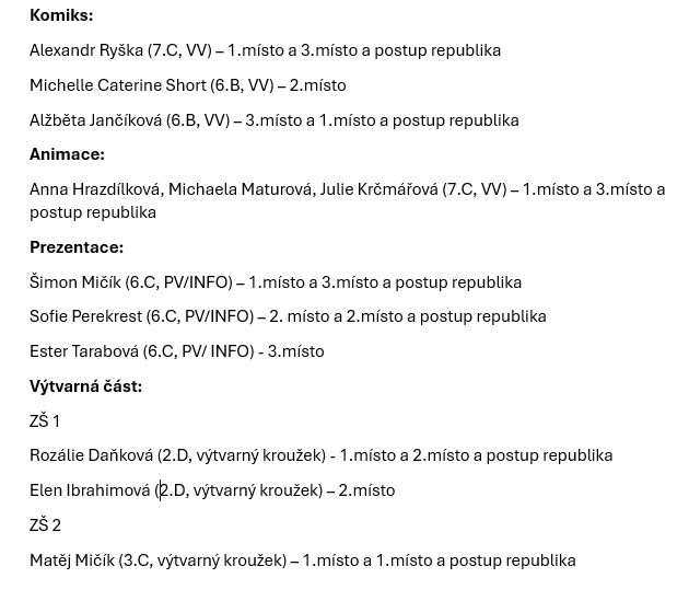 Úspěch našich nadaných žáků v kategoriích okres-kraj-republika najdete v příloze níže.